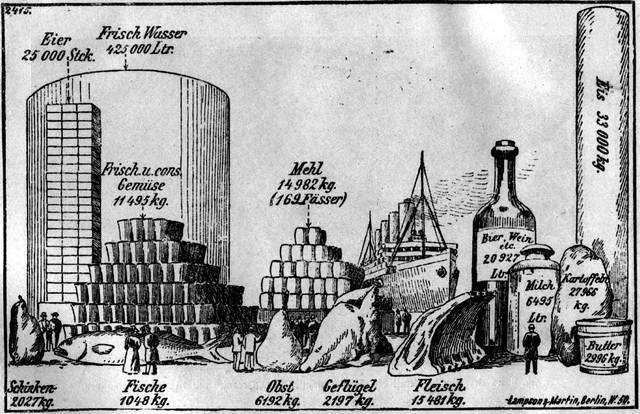 Proviant eines Ozeandampfers für eine Fahrt Europa-USA um 1900: