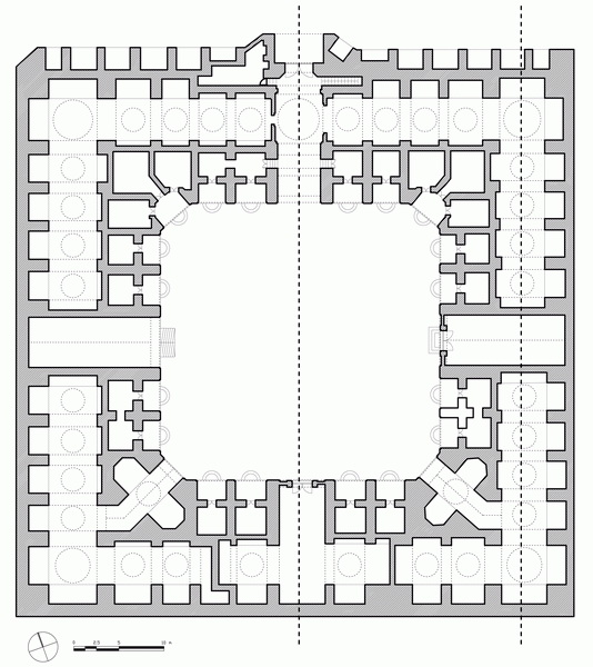 WIKI GEMEINFREI Mitunter wurden auch Pferde und Esel mitgeführt. Unter einer „Karawanserei“ verstand man eine „Raststätte“, wo man – geschützt vor Klima und Räubern – die Nacht verbringen konnte. Hierbei handelte es sich um durchaus respektable Vierkanter. Grundriss einer Karawanserei: