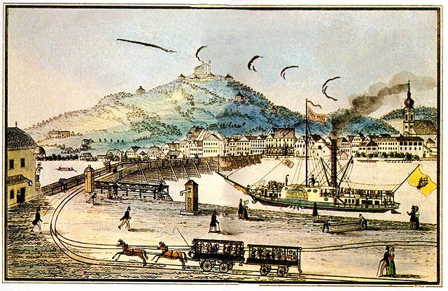 WIKI GEMEINFREI „Die erste Eisenbahn, welche in Oesterreich für den Verkehr von Reisenden und Gütern angelegt wurde, ist jene zwischen der Moldau und Donau, oder von Budweis bis Linz; die Veranlassung derselben lag in den Verhandlungen der Bevollmächtigten der zehn Elbeufer-Staaten, welche sich in Folge der Wiener Congressacte im Jahre 1819 in Dresden versammelten, und dort eine Convention wegen Regulirung der Elbe-Schiffahrt abschlossen. Die freie Schiffahrt auf der Elbe begann im Jahre 1821, und die Commission in Dresden hatte sich vor ihrer Auflösung an die österreichische Regierung mit dem Ersuchen verwendet, die Schiffahrt auf der Moldau bis Budweis zu reguliren, und von dort bis zur Donau einen Canal oder eine Eisenbahn(= Hervorhebung d. Verf.) anzulegen, damit auf diese Art Güter von Hamburg bis zur Donau, und umgekehrt befördert werden könnten. Im Jahre 1822 wurde ich von dem damaligen Präsidenten der Commerz-Hofstelle aufgefordert, mich an die Spitze der Unternehmung zu stellen, und nahm sofort die nöthigen Local-Untersuchungen der Gegend vor“. Die erste Idee, zwischen Moldau und Donau eine „Eisenbahn“ anzulegen, hatte übrigens schon sein Vater Franz Josef v.Gerstner(1756-1832) im Jahre 1808 gehabt. Das Bahnprojekt war also Teil eines in der Tat weitläufigen ökonomischen Kontextes.(s.o.) Trotzdem fasste man ursprünglich vorwiegend das Salz als Transportgut ins Auge. Dieses wurde schon seit Jahrhunderten – vor allem auf dem Wasserweg(Traun, Donau, Moldau) – vom Salzkammergut bis nach Böhmen befördert. Nach Errichtung der Eisenbahn gesellten sich dann im Lauf der Zeit zum Salz noch zahlreiche andere Güter dazu. Die Fahrt von Urfahr(= offiziell „Urfahr(Linz)“)nach Budweis dauerte im Personenverkehr ungefähr 14 Stunden(!) und war somit völlig unmodern. Dazu kam noch, dass weder Schlaf- noch Speisewagen existierten. Vielmehr legte man in Kerschbaum – am Hochpunkt der Bahn – eine „Mittagsrast“ nach dem altvaterischen Postkutschen-System ein. Dazu schrieb der Biedermeier-Schriftsteller Franz Carl Wiedmann: „Kerschbaum ist der Ort zum gemeinschaftlichen Mittagsmahl. Drei große, schon gedeckte Tische sind in dem Speisezimmer bereitet. Die hier zusammengetroffene Gesellschaft aller vier Wagen bestand aus 42 Personen ... Das aufgetischte Gericht bestand aus Suppe, Rindfleisch und zwei Soucen, Braten und Salat. Der Braten teilte sich in Hühner- und Wildbraten. Der letztere war gänzlich ungenießbar und verbreitete einen entsetzlichen Gestank im ganzen Zimmer. Die übrigen Speisen waren gut zubereitet. Man bezahlte mit Einschluss einer Flasche Bier 3 Kronen. Schwarzer Caffee wird extra bezahlt. Der Wildbraten abgerechnet, welcher auf allgemeines Verlangen sogleich hinausgeschafft ward, ward den Gerichten weidlich zugesprochen“. Das alles kostete natürlich viel Zeit… Personentransport auf der Budweiser-Bahn: