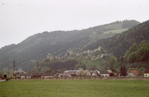 Bei Launsdorf führt eine Brücke über die Gurk, an welche sich der Fahrweg bis an den Fuss der Burg anschliesst. Nebst einem steilen Fussteige führt ein enger Fahrweg durch 14 Wachthäuser und Thürme und auf 3 Brücken über furchtbare Abgründe zu dem Schlosse hinauf. Eine Menge Thürme ragen aus dem Mauergurt hervor, der durch Zugbrücken ununterbrochen terrassenförmig an der Eisenbahnseite bis zum höchsten Gipfel des Steinblockes hinaufreicht und oben mit dem Kirchlein und eigentlichen Burggebäude gekrönt ist.(...)