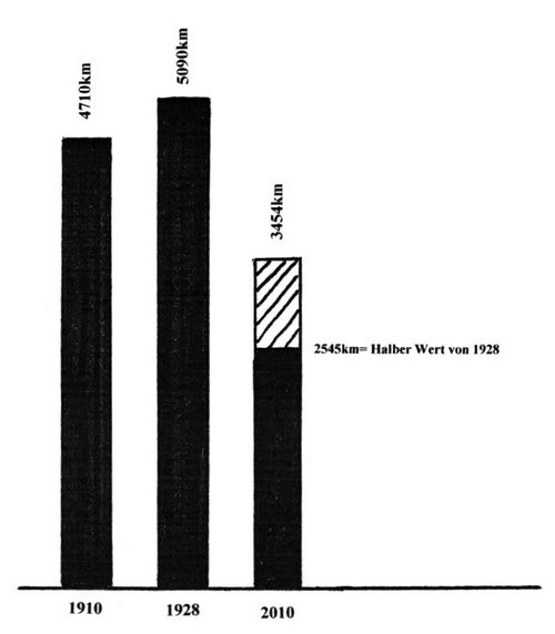 Copyright: Elmar Oberegger Nach dem Ende des Zweiten Weltkrieges war man einerseits nicht geneigt, kriegszerstörte Linien wieder aufzubauen, andererseits rationalisierte man sogenannte „unrentable Linien“ einfach weg. Und immer erschien dabei „Der Autobus“ rentabler als die Bahn. Beigegebene Statistik zeigt, dass es zwischen 1928 und 2010 nahezu zu einer Halbierung der Belgischen Eisenbahnkilometer gekommen ist; zwischen 1928 und 2010 wurden ca. 20 Eisenbahnkilometer pro Jahr stillgelegt. Der heutige Wert an Eisenbahnkilometern unterschreitet sogar jenen von 1910 deutlich. Eisenbahnkilometer in Belgien: 1910, 1928, 2010 im Vergleich.