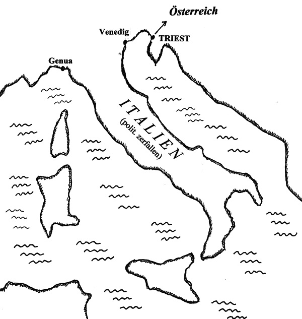 WIKI GEMEINFREI Eine Skizze. Das relativ unbedeutende, aber politisch freche und höchst selbstbewusste Triest sah seinen politisch-militärischen Ausweg damals aber nur darin, mit selbstdarstellerischem Gestus in die Arme des mächtigen Nachbarn „Österreich“ zu sinken. Das war im Fall des Falles die „Beste Kriegsmaschine“ v.a. gegenüber dem Erzfeind Venedig. Der politische Anschluss fand feierlich im Jahre 1382 statt. Die „Italienischen Seemächte“ Genua und Venedig – Und am Rande Triest: